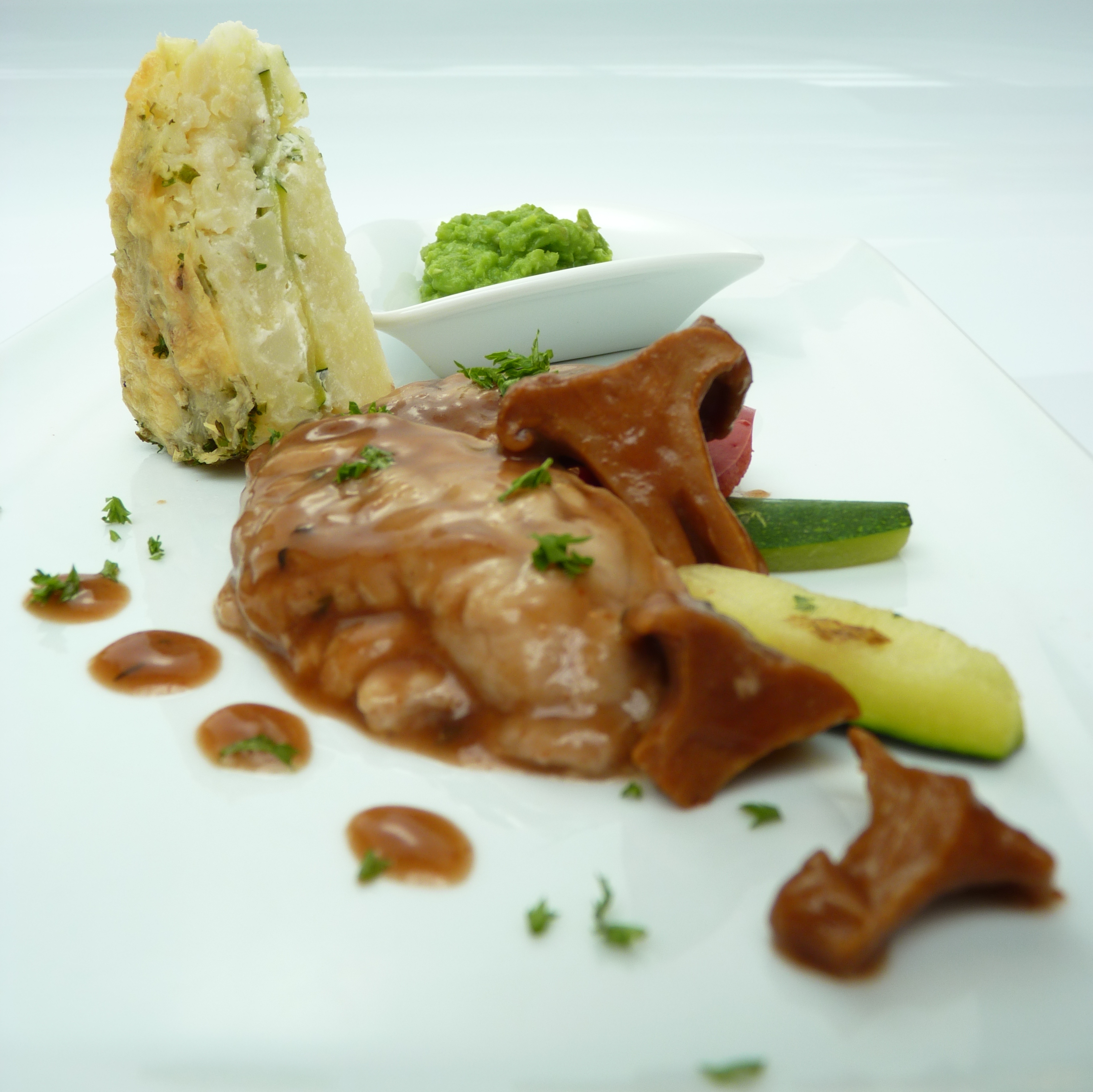 Egy szelet burgonyatortát rakunk mellé a zöldborsó coulis-t pedig külön tálkában helyezzük a tányérra.